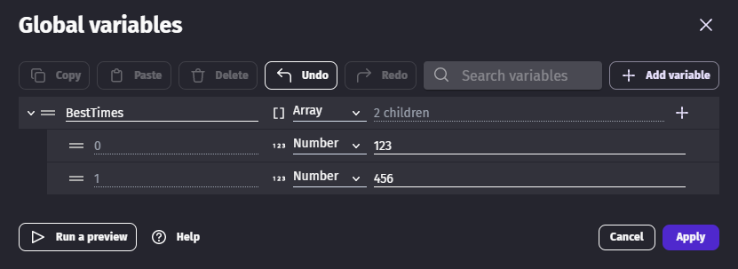 For example, imagine storing the player's score for each level. If you want to show the player's score for a specific level, you may store the current level number in a variable called CurrentLevel. You can then use the following syntax to access the score: