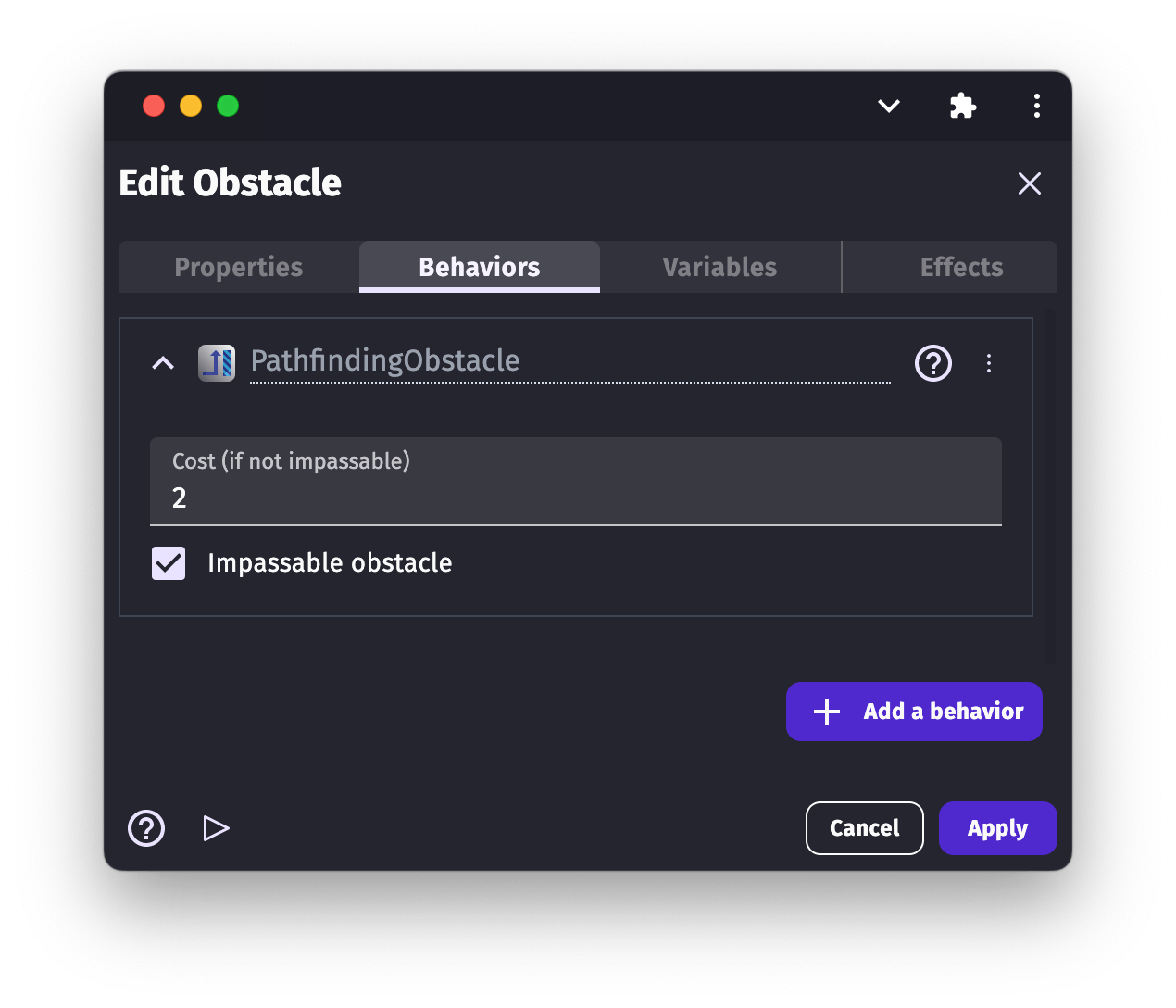 - cost: if the obstacle is not impassable, a cost can be set for the obstacle. The moving object, when looking for the best possible path to a destination, will prefer to avoid obstacles with high-cost values. For example, a river might have some cost. The moving object, if possible, will avoid it. However, if there is no other way around the river, or if the river has a lower cost compared to another area, the moving object will go through it (instead of climbing a mountain with a higher cost for example). And if we put crocodiles into the river and increase its cost, the moving object might decide to climb the mountains instead. The cost value is a multiplier applied to the path length through that obstacle.
