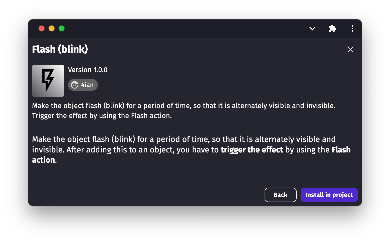 The description usually explains how to use the extension. Here, it is a behavior that you can add to an object, with an action to make the object flash for a bit of time (like in old platformer, when you are hit by an enemy).