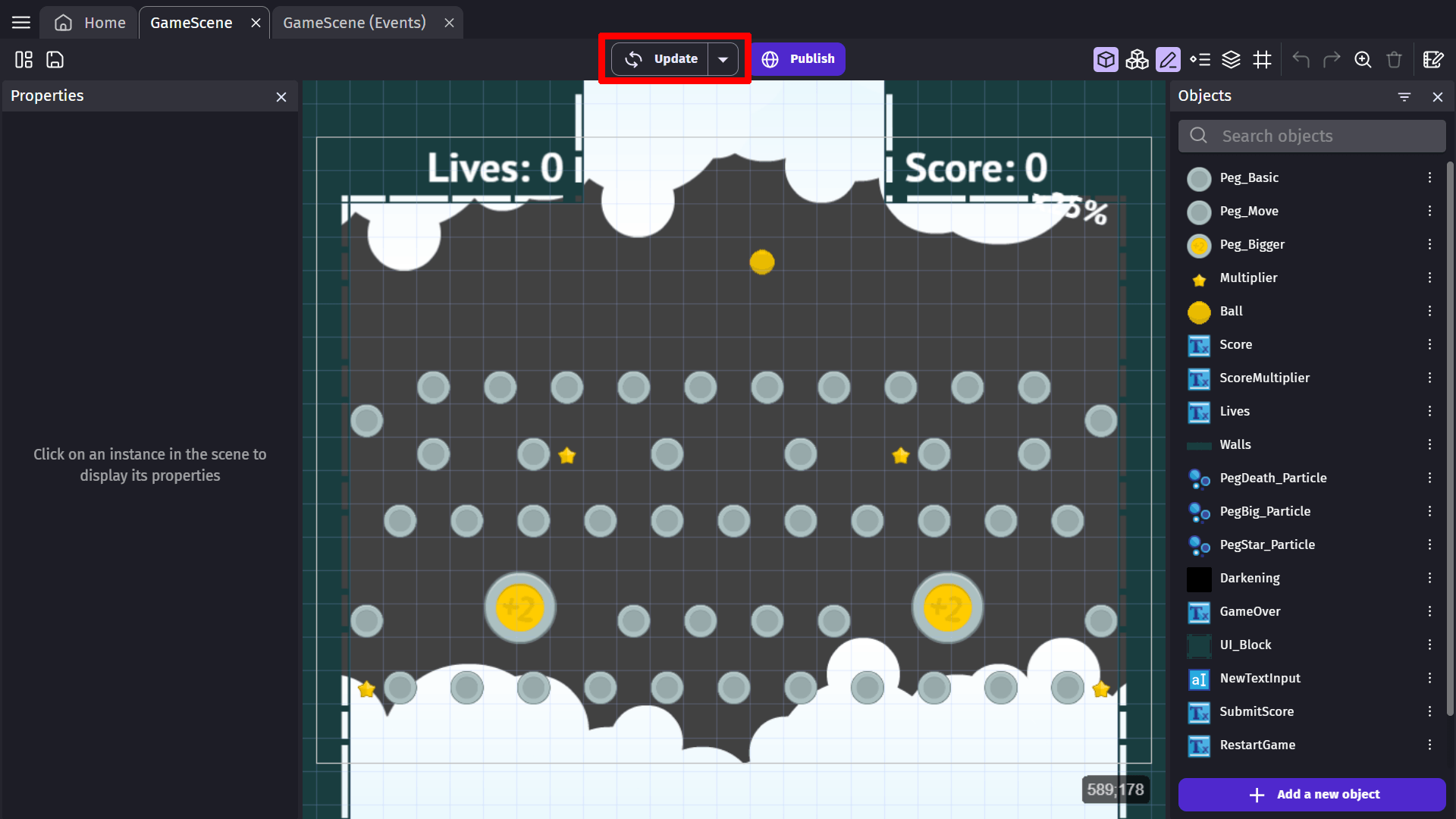 When the preview of your game is running, the preview button changes to an Update button, which will apply changes you've made to the game to the preview. This is useful for designing your game while playtesting it, allowing you to quickly see and test the result without having to restart from the beginning of the scene after each change (this is called "Live Preview" or, using more technical terms, "Hot Reloading"):
