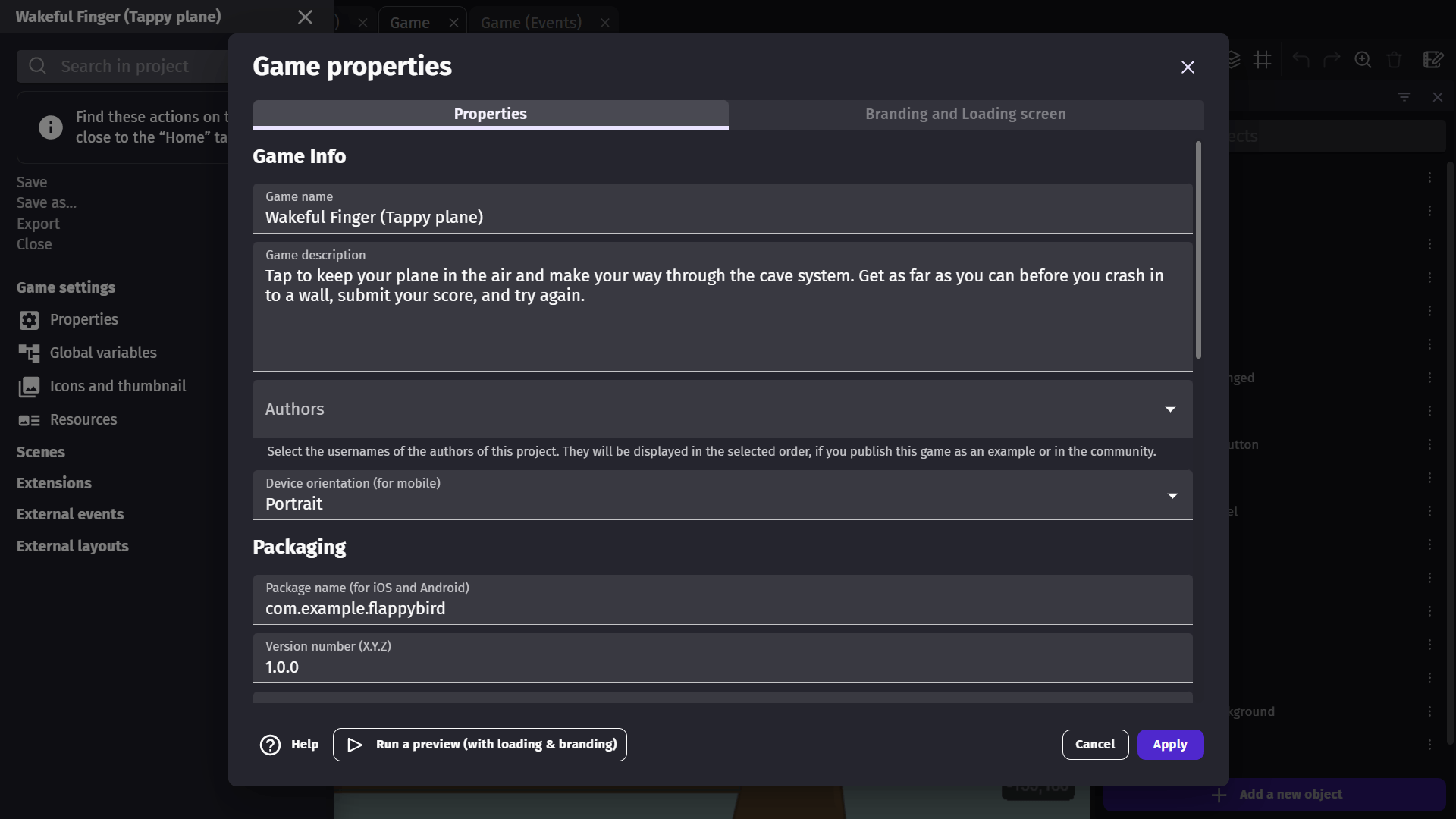 - Game description: The description for your game that will be used if you upload to GDevelop's game hosting platform, gd.games.