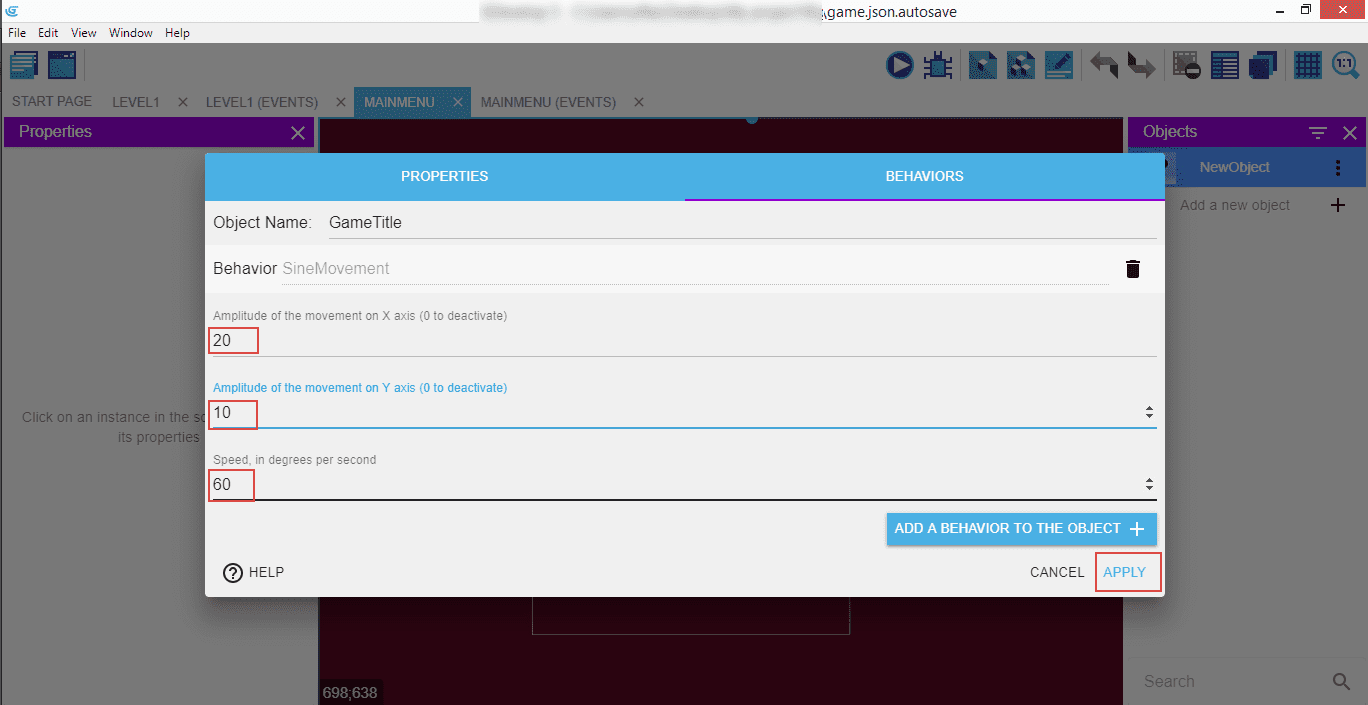 Configure it: set the name to "GameTitle", "Radius on the X axis of the movement" to 20, "Radius on the Y axis of the movement" to 10, and the "Loop duration" to 6 seconds, then click "Apply".