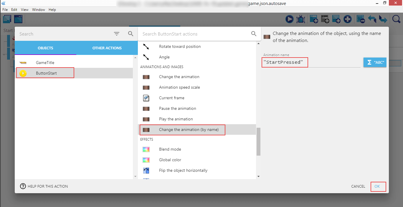Let's add the animations to that button. Select it in the left panel, click "Change the animation (by name)" in the middle one, and enter "StartNormal" in the right panel.