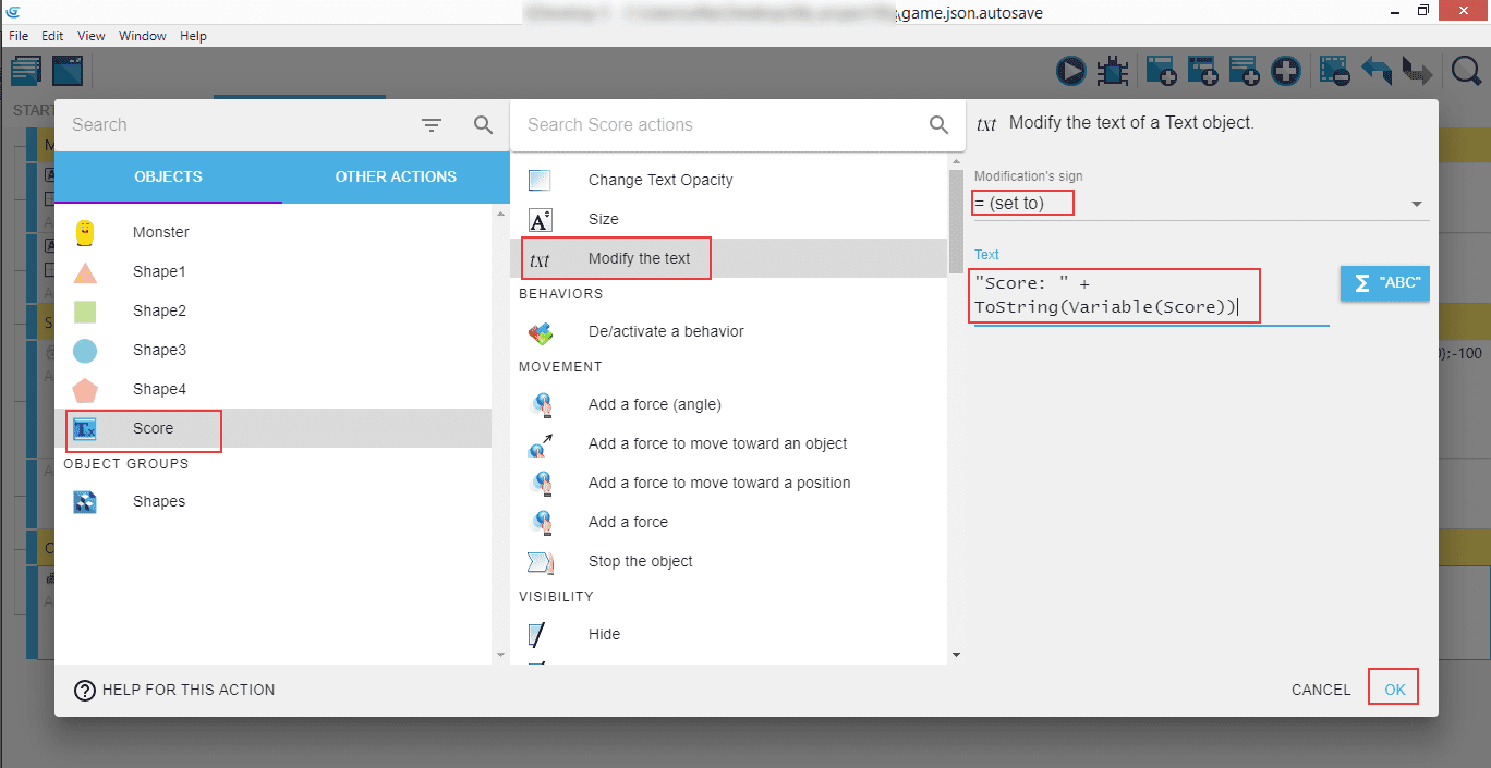 Go to the "Level1 (Events)" tab, click "Add an action", and in the popup select our new "Score" variable, look for "Modify the text", and in the right panel select "Modification's sign" to = (set to), with the text "Score: " + ToString(Variable(Score)).