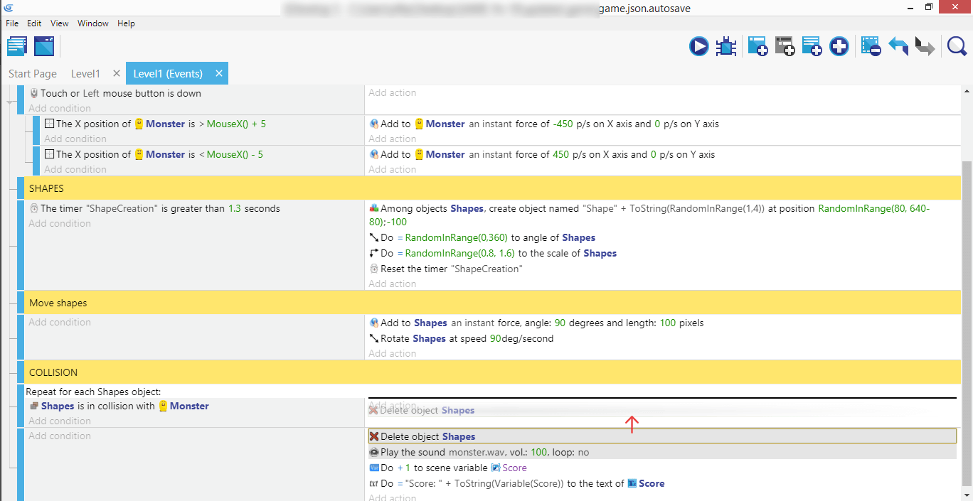 This is in fact a bit incomplete: in case we're collecting two shapes at the very same time, we'll only get one point! This is because the condition will be considered "true" for both shapes that are colliding with the monster, but the action is then only run once. We'll fix that in a few moments with a "For Each" event.