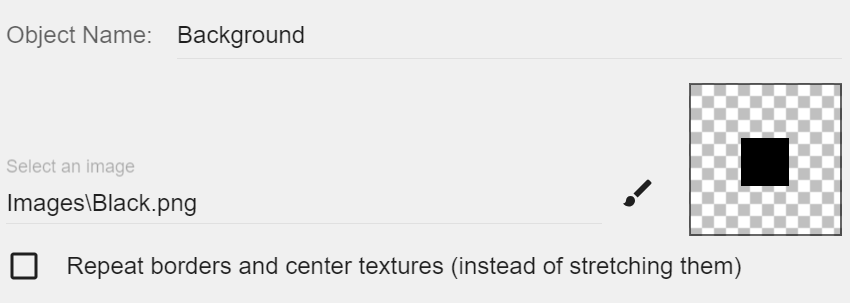 Upon clicking the Panel Sprite option a dialog box, to change the properties of this object, appears. When you first add a new object, it will given a default name such as NewObject. You can rename this to better organize your Object space. Notice that I have changed my object's name to Background. Choose the black background from the assets provided and click on Apply.