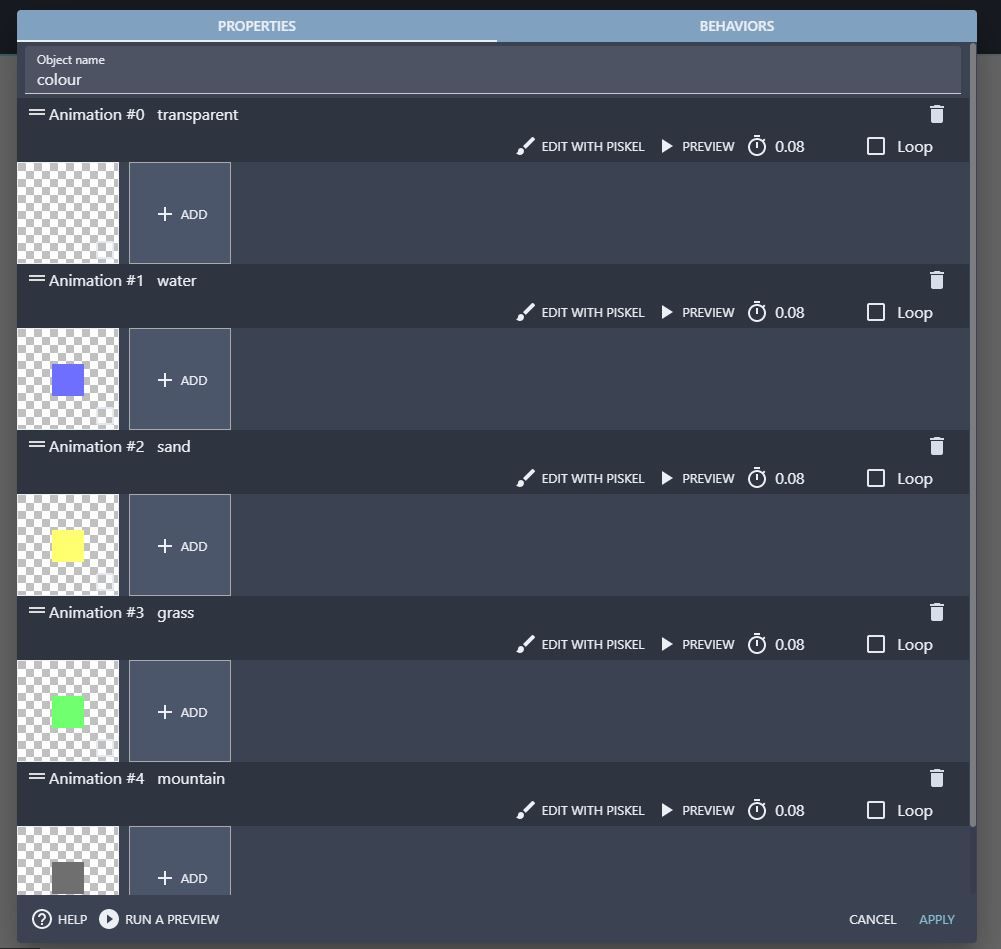 Go to your tile object and add animations for each type of terrain wanted. For this example blue, yellow, green, and grey animations will be added. To represent water, sand, grass, dark grass and mountains. But, any colour or sprite could be used. Then duplicate the tile object and name it colour. Change the first animation (the black one) to a transparent square of the same size.
