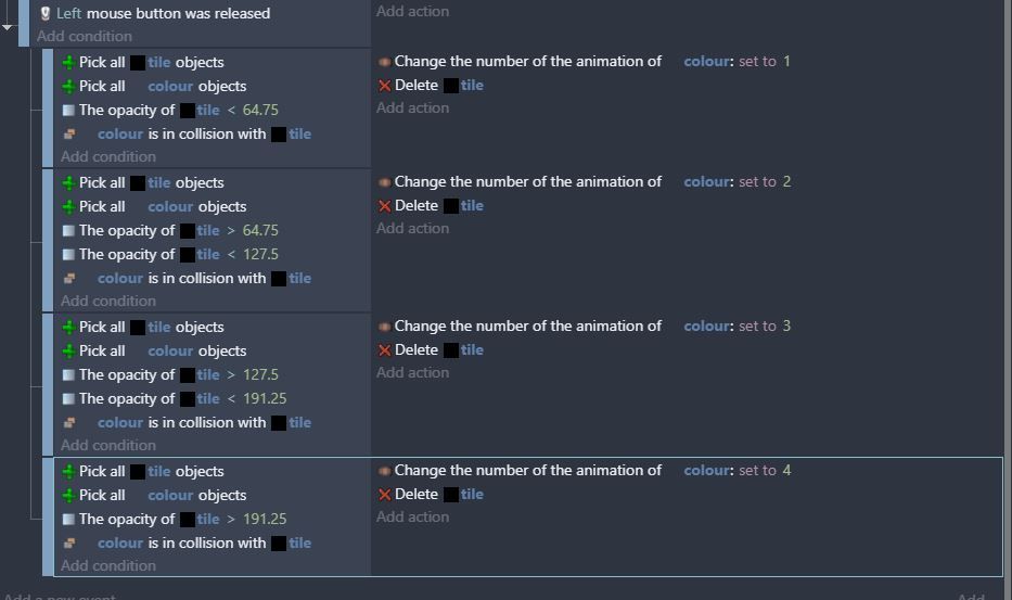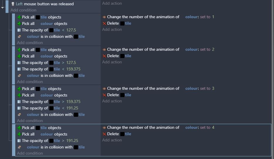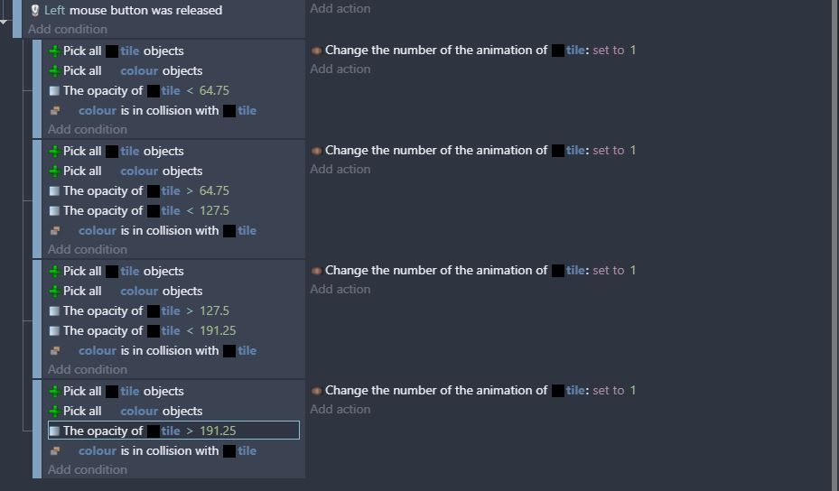 Next, create a new event then give it the condition of the left mouse button released. Then, create a sub event on the mouse button released event with the condition of pick all tile objects and the opacity of tile is \< 127.5. Finally, add an action to change tile animation to 1.