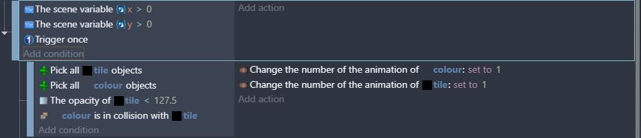 Then change the object in the change animation action from tile to colour. Also, for each sub event set the animation one higher than the event above it. Lastly, add a new action to delete the tile object for each event.
