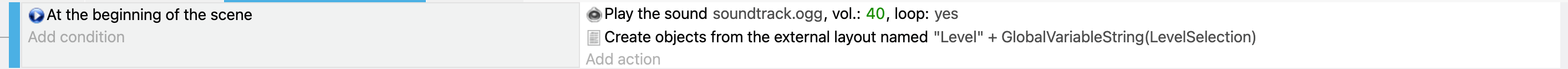 Create a new global variable called "LevelSelection" and set its initial value to 1. Then, change this variable to open the specific level (e.g., change it to 2 to load Level 2). Then add an action to run Base Scene. In the end, your events should look like this: