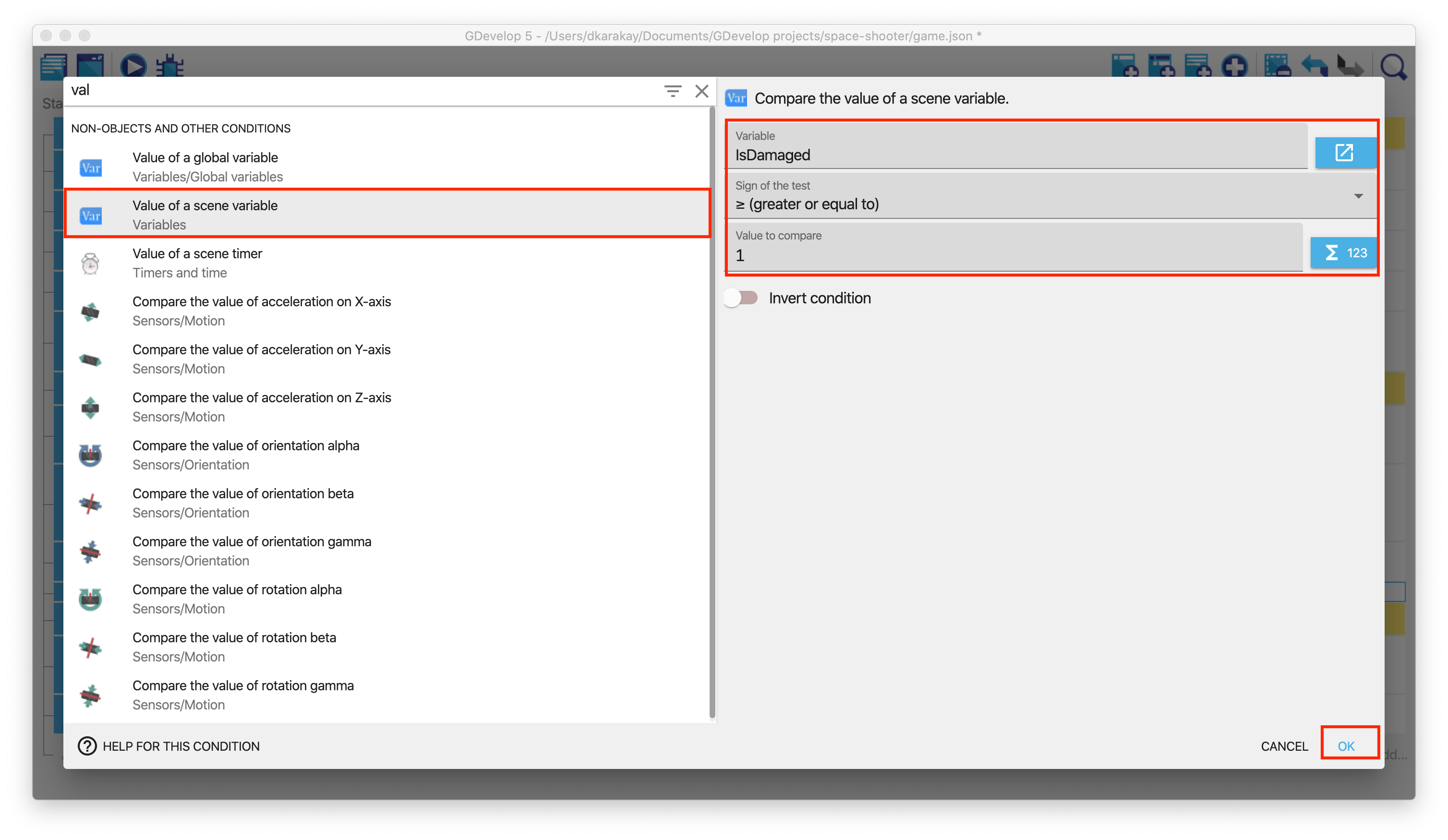 Now, create an action and type "variable" on the search bar. Then, select Value of a scene variable and click on the button next to the action details. In this window, create a scene variable called "IsDamaged" and give its initial value 0. Then click apply.