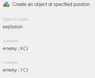 When we created the explosion object, we used the expressions enemy.X() and enemy.Y(). We created the "explosion" objects at the "Origin" point of the "enemy" object. The "Origin" point is, by default, located at the top left corner of the "enemy" (0). We are also creating the explosions from their "Origin" point, which is the top left corner of the "explosion" object(0).